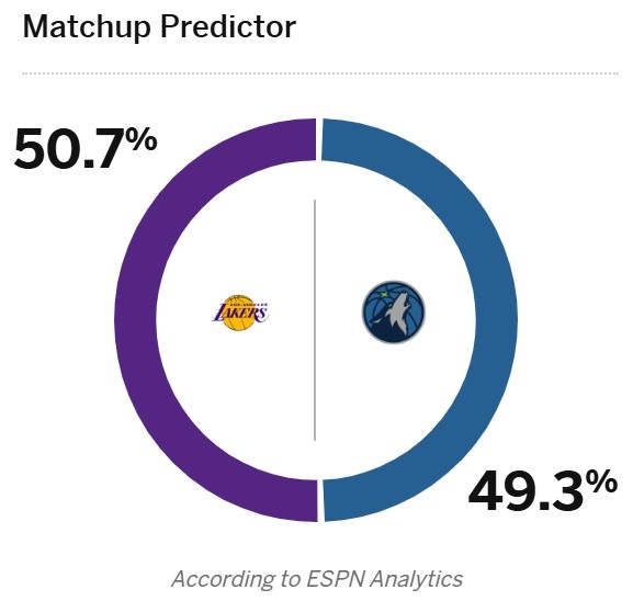 4月26日訊 NBA季后賽首輪G3,森林狼主場116-104力擒湖人。ESPN更新了兩支球隊G4的勝率,其中湖人50.7%略占優(yōu)勢,森林狼49.3%。湖人和森林狼的G4將在后天凌晨3點30開打。